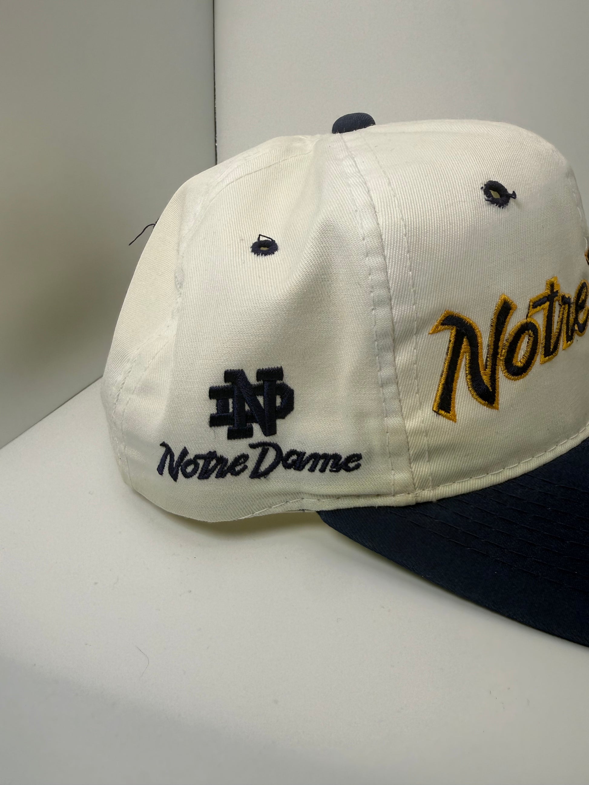 Vintage Notre Dame Sports Specialties Script Snapback - light staining on bottom of dome, note pictures.